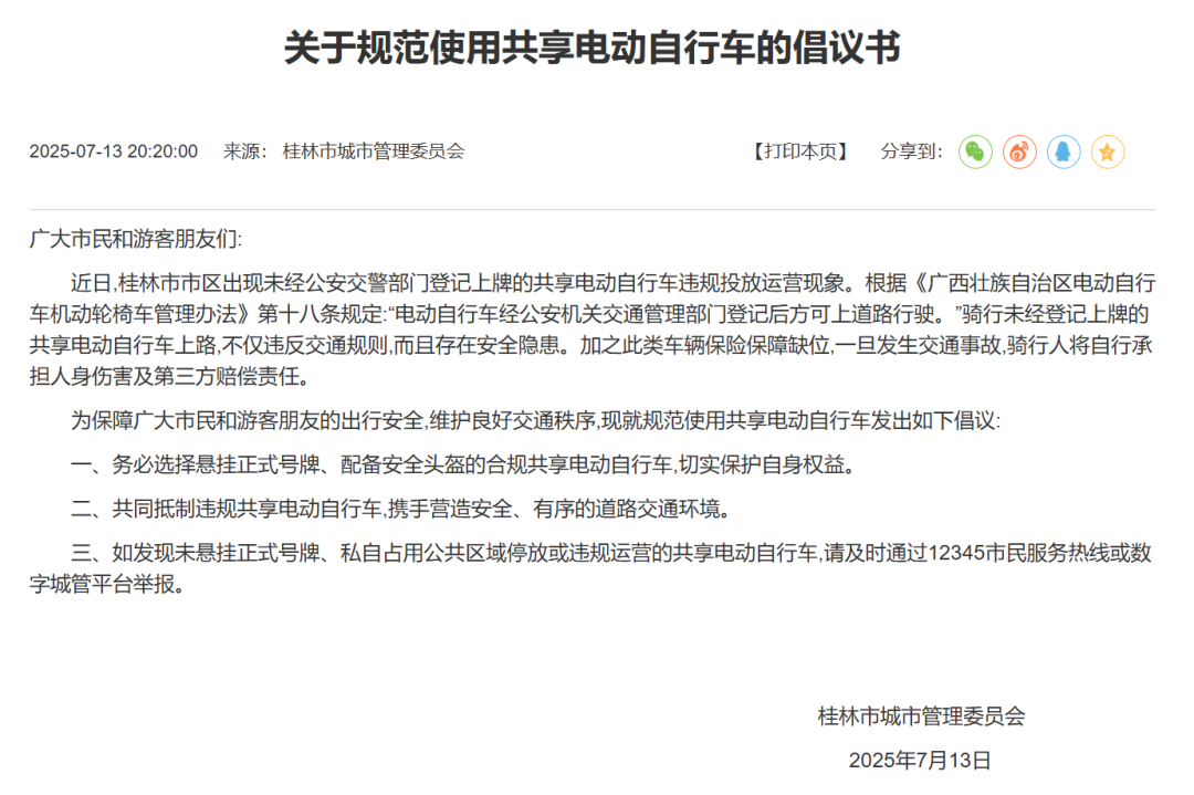 此前,在今年7月13日,桂林市城管委发布了《关于规范使用共享电动自行车的倡议书》。其中第二条是倡议市民和游客共同违规共享电动自行车,携手营造安全、有序的道路交通环境。