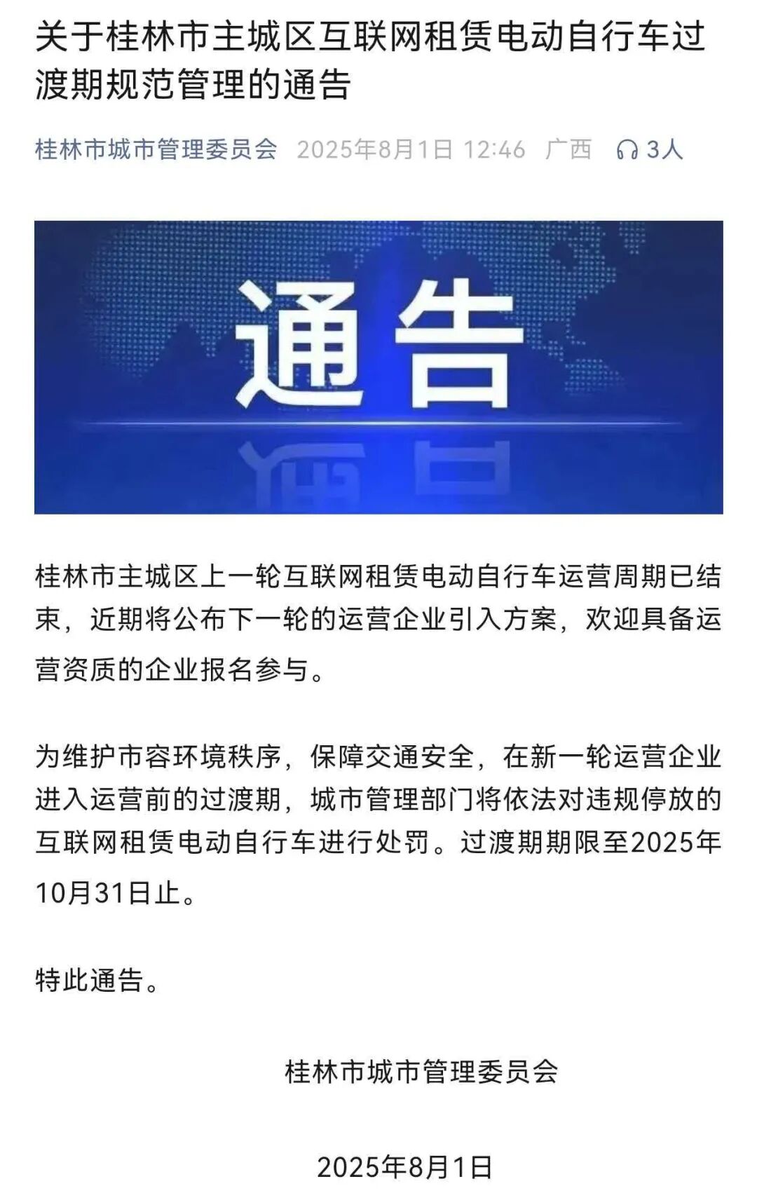 8月1日,桂林市城管委又发布了《关于桂林市主城区互联网租赁电动自行车过渡期规范管理的通告》。其中明确了过渡期期限至2025年10月31日止。