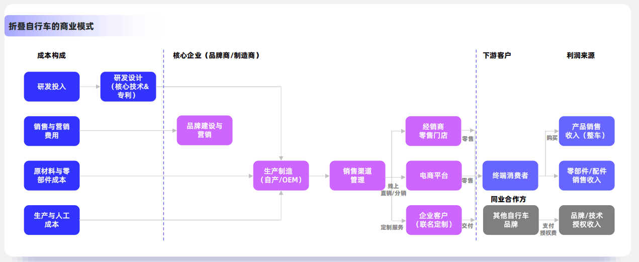 折叠自行车行业的商业模式核心是通过技术研发和品牌塑造,提供具备高附加值的产品,并通过线上线下结合的渠道触达消费者,最终实现产品销售和后续服务的盈利。目前有2种主流盈利范式: