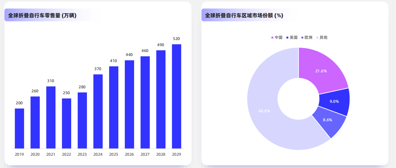 在全球绿色出行浪潮与城市化进程的双重驱动下,折叠自行车市场步入高增长快车道。全球销量从2019年的200万辆跃升至2024年的370万辆,年复合增长率(CAGR)高达13.4%。