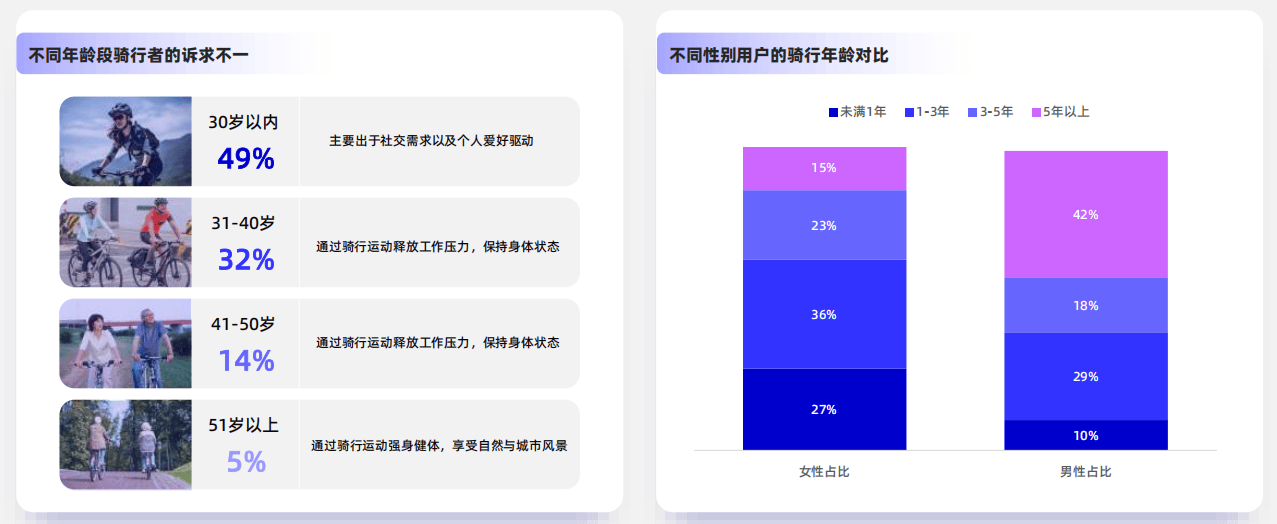 从不同年龄段的骑行群体的诉求来看,30岁以内的年轻群体更多是出于社交需求以及个人爱好驱动,31岁及以上群体保持骑行习惯则更多出于身体健康角度考虑。