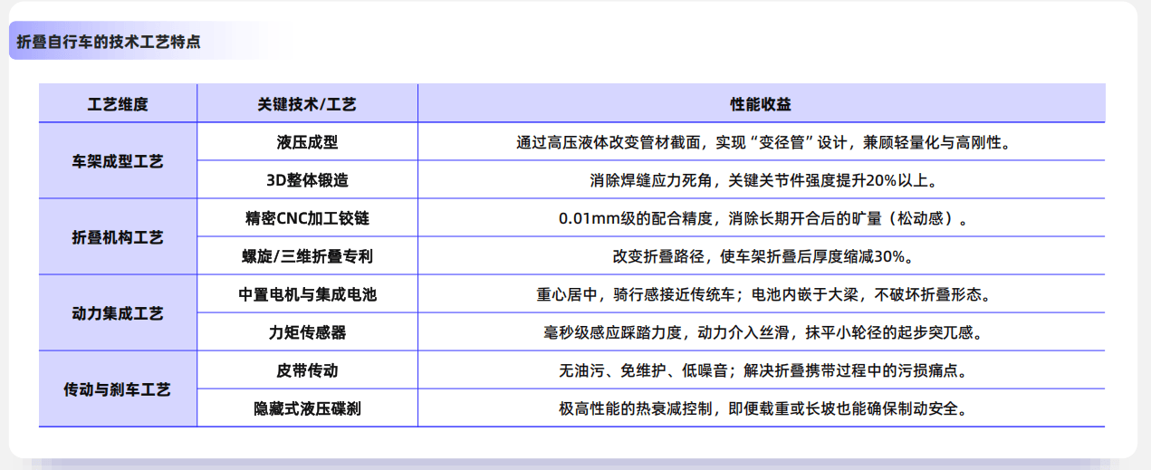折叠自行车技术与工艺进阶的核心,在于平衡便携性与专业性能的双重诉求——既要通过极致的体积压缩实现灵活收纳,又需确保骑行稳定性、负载能力等核心指标不妥协。从工艺实现路径看,其技术体系涵盖四大关键环节:车架成型工艺、折叠机构工艺、动力集成工艺、传动与刹车工艺。其中,折叠机构工艺堪称折叠自行车的“灵魂”,它通过结构创新突破了传统自行车的形态限制,既是便携性的物理载体,也是界定其与常规车型差异的标志性特征,直接决定产品的用户体验与安全冗余。