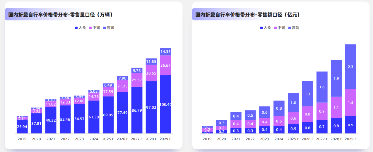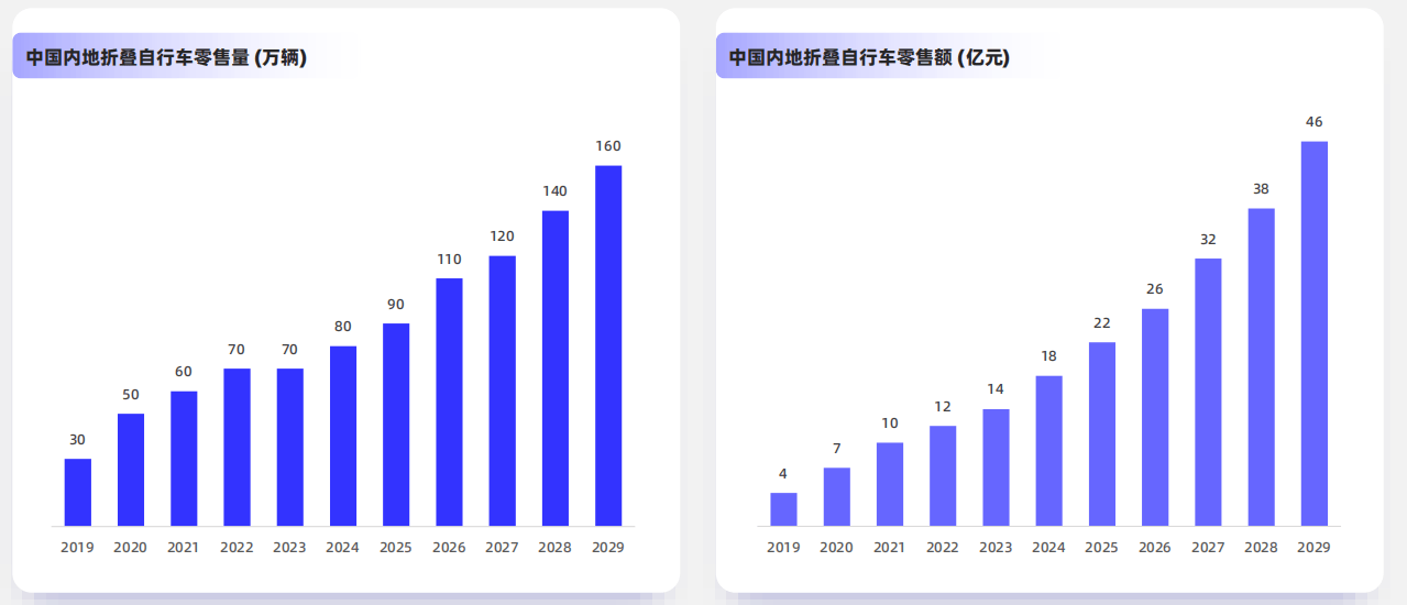 国内折叠自行车零售市场呈现量价齐升的特点。零售量从2019年的30万辆增至2024年的80万辆,复合增长率为19.9%,预计2029年行业销量达到160万辆,2024-2029年的复合增长率为14.5%。