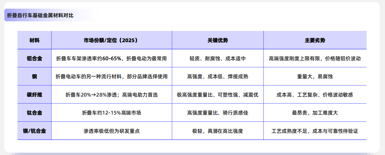 折叠自行车上游原材料如钢、铝合金等属于大宗商品,市场竞争充分。 当前材料轻量化已是大势所趋,车架材料从传统的钢材向铝合金、碳纤维、钛合金等更轻、更高强度的材料演进,也是产品高端化的关键。