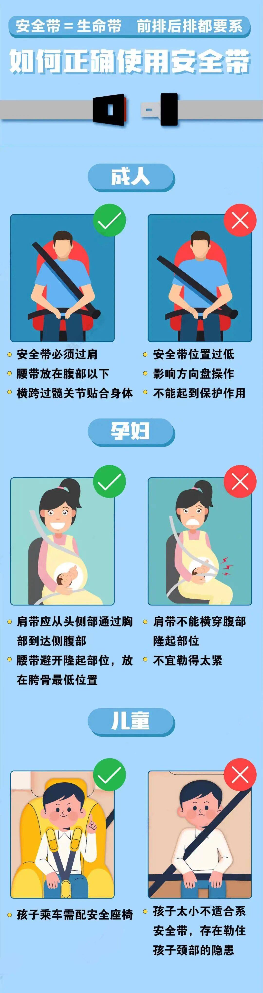 因此,不论在前排、后排,还是高速、低速,一定要“全程、全员规范系好安全带”。对于年龄尚小的儿童,还需配备适应其身高的儿童安全座椅或增高垫。