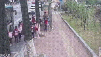 ▲放学的学生们追赶还未停稳的公交车,紧挨着公交车的同学被撞倒,紧接着右手被卷进车底,致右手严重擦伤。