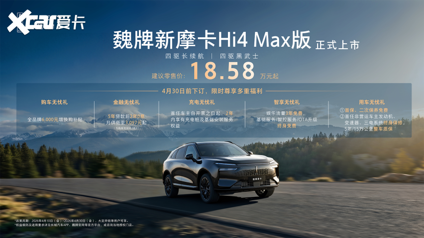4月10日,魏牌新摩卡Hi4 Max版焕新上市,推出四驱黑武士、四驱长续航两个配置,官方指导售价18.58万元,此次新车以18万级亲民定价,打破四驱SUV价格高、门槛高的行业惯性,