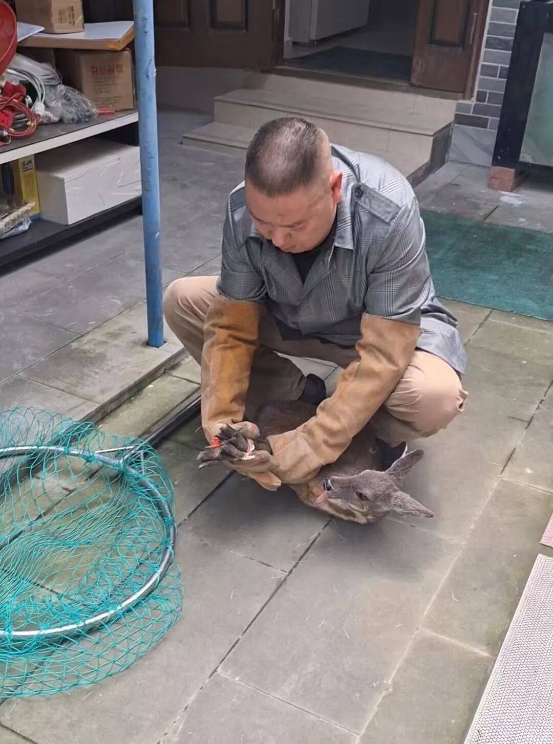 抵达后,工作人员发现这只动物躲藏在小区自行车棚内,性情警觉、行动活跃。经辨认,这是国家一级保护野生动物林麝。因小区人员密集,且紧邻公路,为避免林麝受惊逃窜发生意外,野保人员联合小区安保人员,利用专业工具耐心围捕。林麝反应机敏,时而跃上围墙,时而跳上花坛。经过近半小时周旋,最终成功将其安全控制,并妥善固定肢体,防止运输损伤。