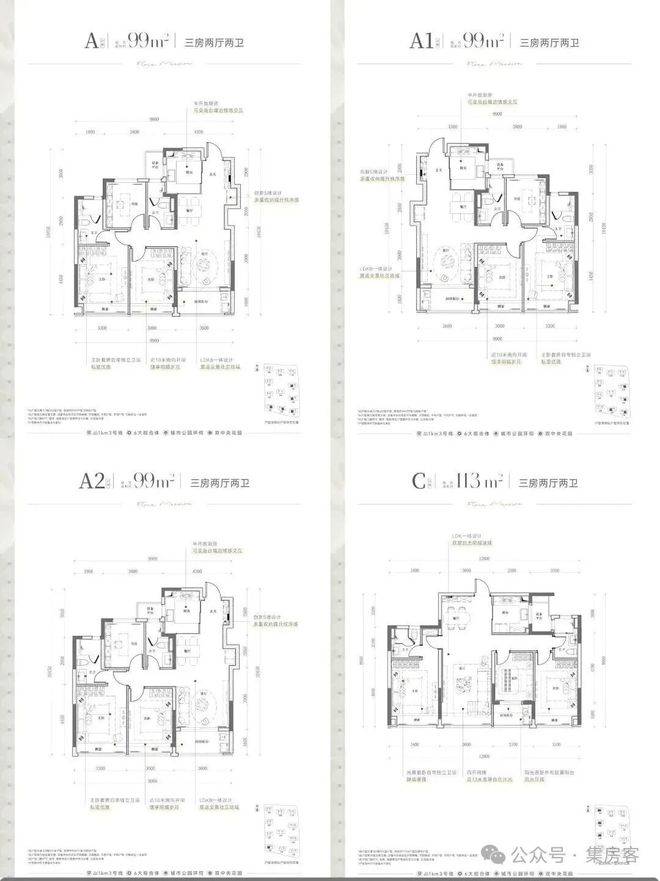 户型设计:建面约99㎡的三房两卫户型,动静分区,采用三开间朝南设计。建面约113㎡的三房两厅两卫户型,四开间朝南,拥有封闭式阳台,南向采光充足,使得整体空间更加宽敞明亮。棠悦芳华轩建面约139㎡生活美学馆